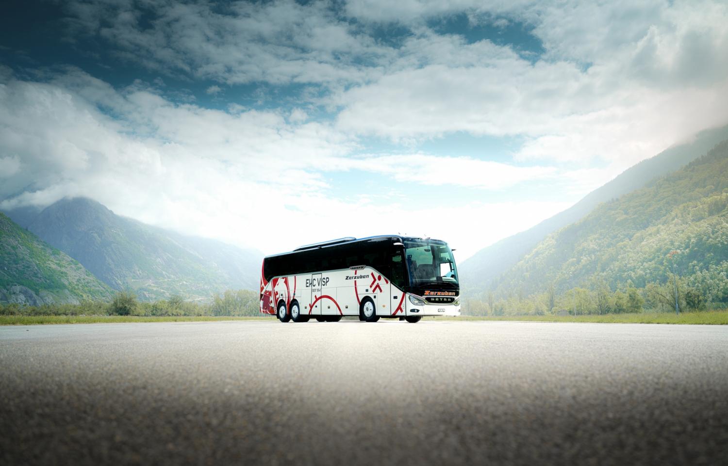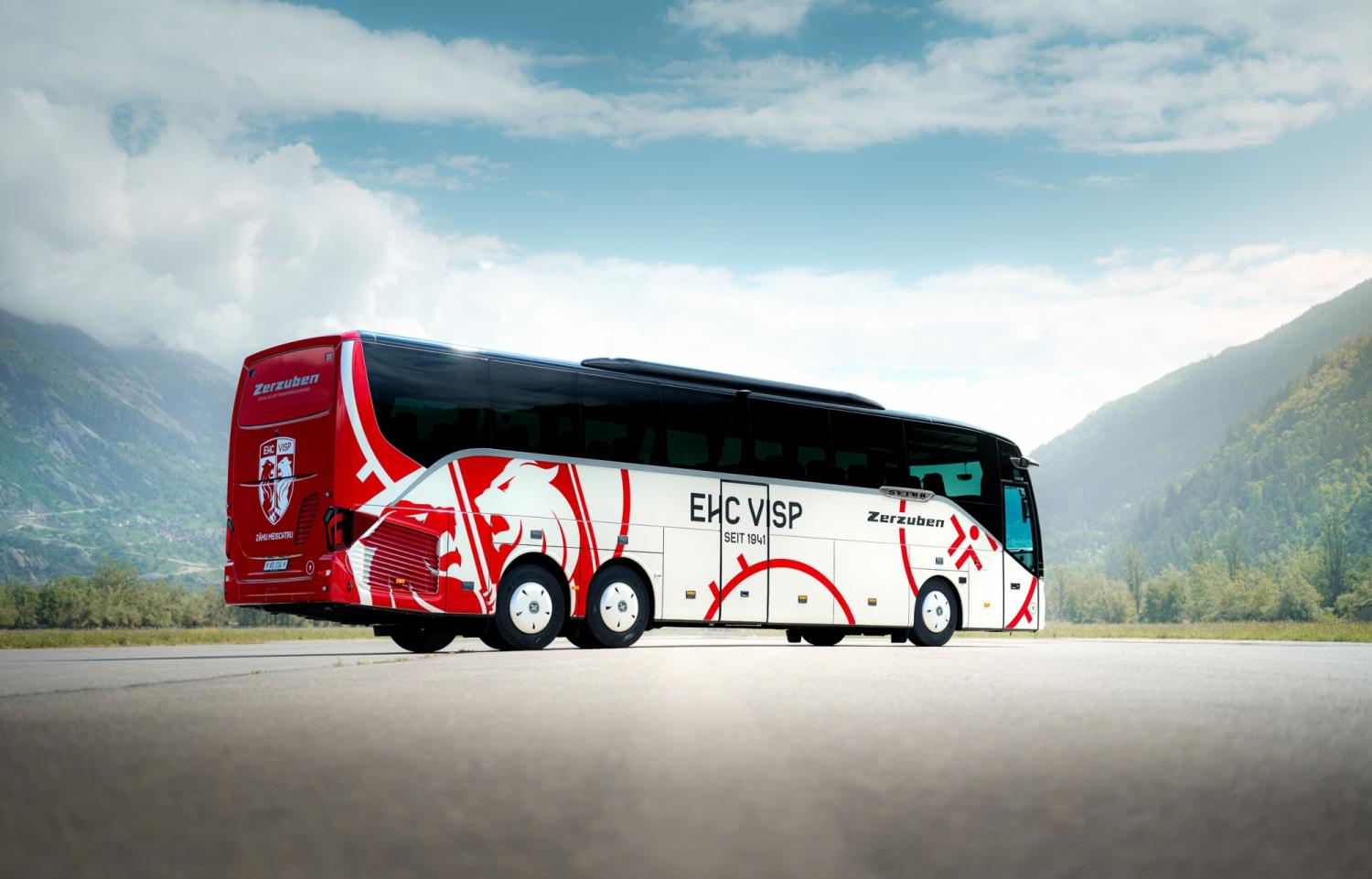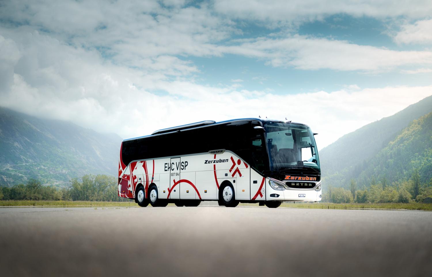 En tant que partenaire de mobilité de longue date, l'entreprise de bus traditionnelle du Haut-Valais accompagne toutes les équipes du HC Viège en toute sécurité et confortablement à travers la Suisse. Pour la prochaine saison 2025/2026, le champion suisse en titre de la Swiss League recevra un nouveau bus d'équipe. Un véritable point fort sur et en dehors de la route : d'un blanc nacré frappant avec le nouveau design du club du HC Viège, le bus attire tous les regards ! Zerzuben Touristik AG investit ainsi non seulement dans une flotte de véhicules modernes, mais aussi dans le sport, la région et sa philosophie éprouvée : voyager avec un confort maximal, une sécurité maximale et une technique innovante. 2025 marque à cet égard une étape importante dans l'histoire de l'entreprise : l'acquisition de quatre nouveaux autocars Setra marque le début du renouvellement complet de l'ensemble de la flotte.